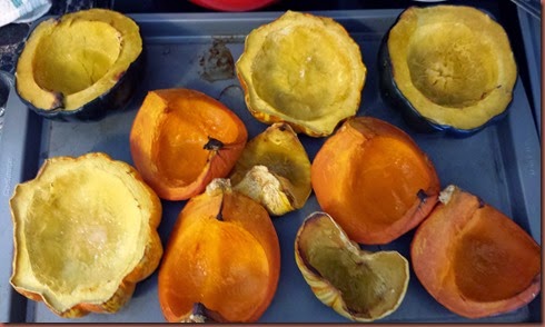 I don’t know much about winter squash other than they keep well and have very hard skins – that, and they are delicious! I picked up several types at random. Acorn squash, Carnival, Sweet Dumpling and Sugar Pumpkin. We also really like Spaghetti squash and Butternut squash. I use a serrated edge knife to saw them open. They’re tough. I’m tempted sometime to get a large clean knife/cleaver and smack the heck out of one samauri style, but that could be scary. I may also simply try poking a hole in one, to allow steam out, and baking it seeds and all, cutting and scooping half way through when it’s softer. I’d appreciate any other ideas for safe squash opening!